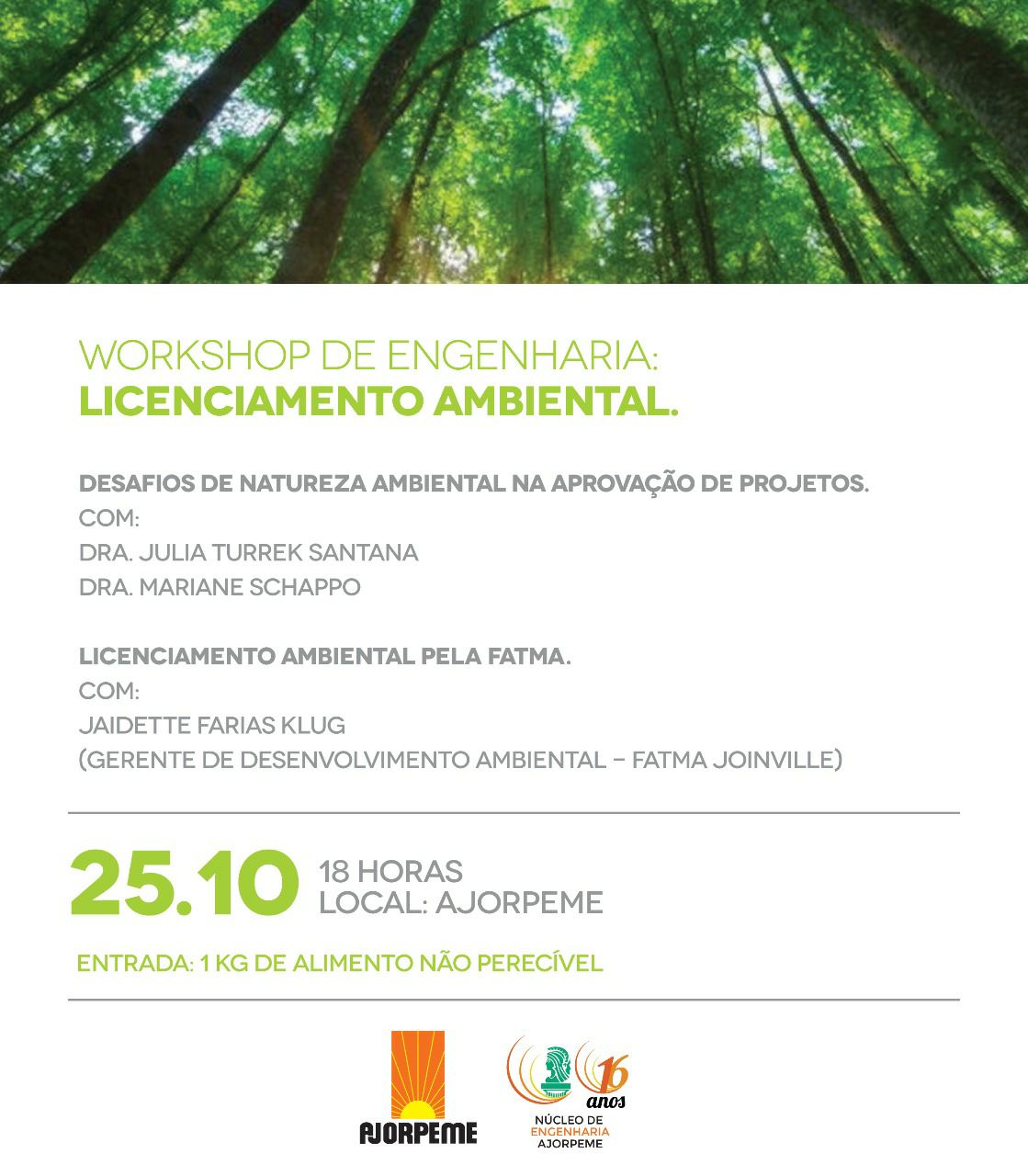 Em comemoração aos 16 anos do Núcleo de Engenharia da Ajorpeme, estaremos juntos falando sobre os Desafios de Natureza Ambiental na Aprovação de Projetos. Será no dia 25/10, às 18 horas!